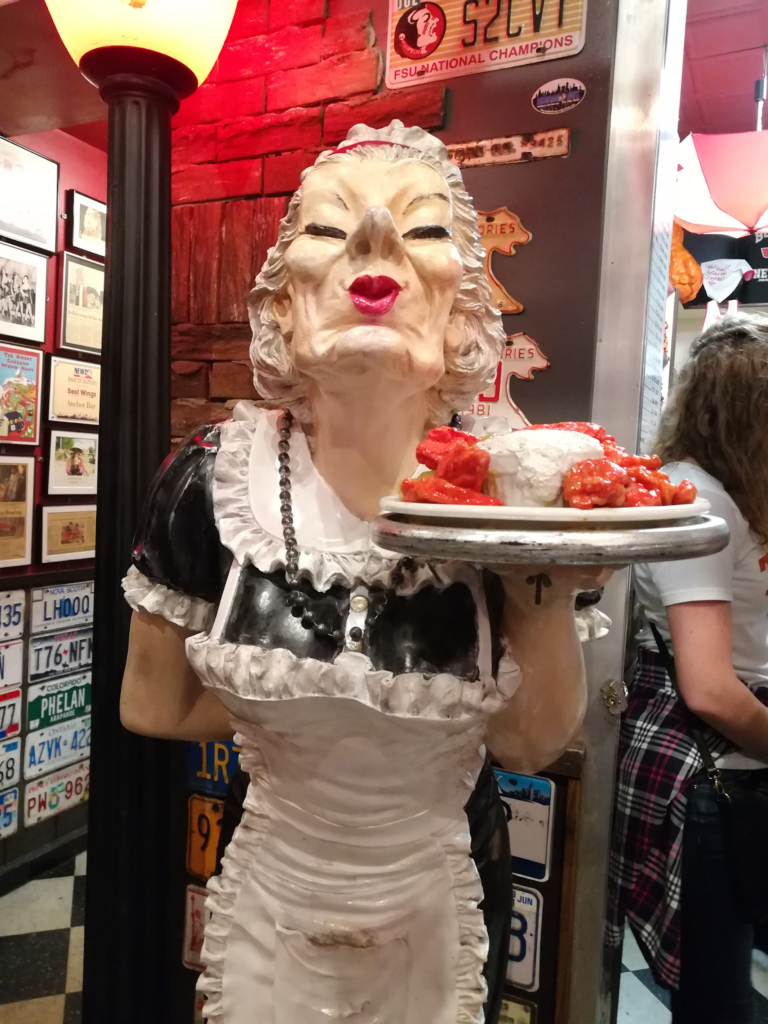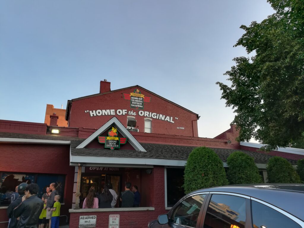 That year, our family of four crossed the border to Buffalo for a trip. First, we visited the warships on the lake, then we strolled around City Hall, and finally, we went to Anchor Bar, located on Buffalo’s main shopping street near North Avenue. In the evening, the parking lot outside was packed; it was difficult to find a spot. Inside, there was an exaggerated statue of Teressa Bellissimo standing at the entrance. The walls inside were covered with all sorts of license plates, and motorcycles were parked near the roof. The bar was overflowing with people.