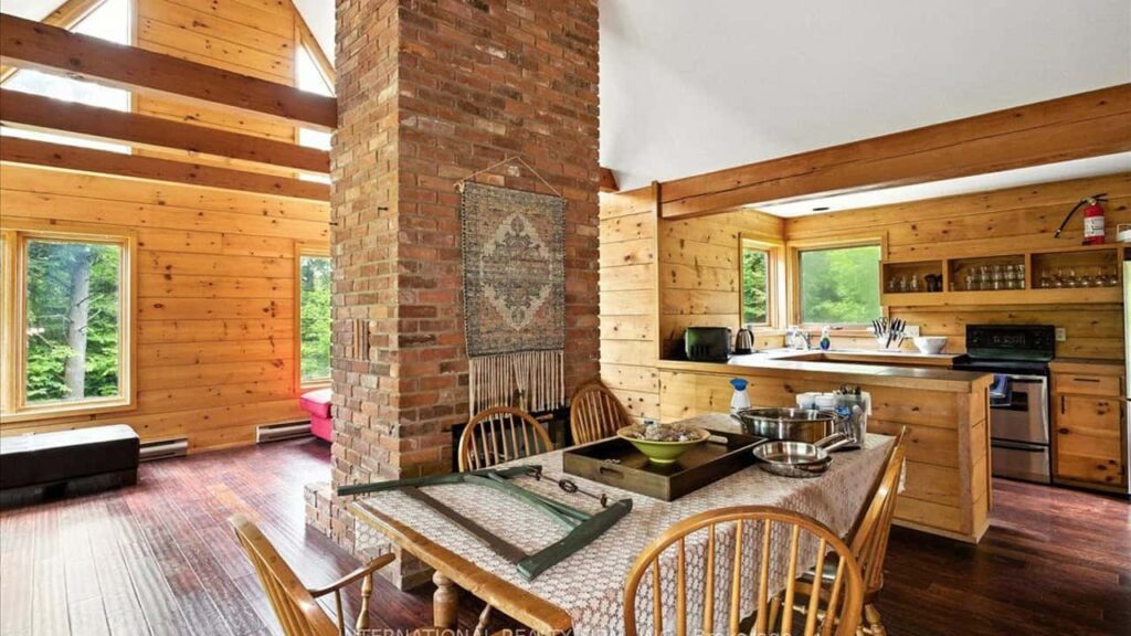 The cottage is described as a “paradise in the woods” on 15.4 acres with access to the Mad River.