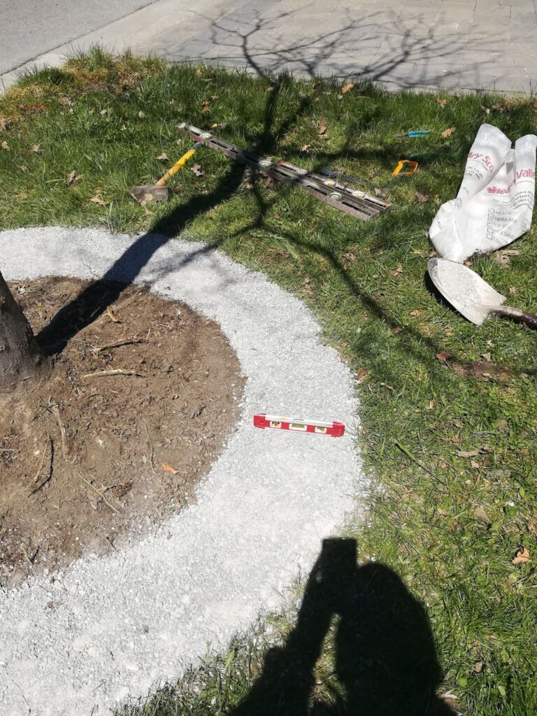 Then, remove the weeds and dig down another two inches. If you encounter protruding tree roots, be sure to cut them off, otherwise the blocks will arch up in the future, which is very unsightly.