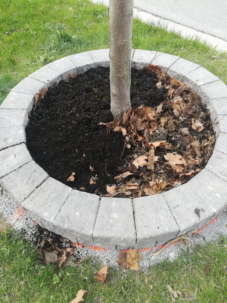 To let the glue dry, I waited until the next day before filling it with soil. Some dry leaves are added to the lower layer as compost. Fill with store-bought garden soil and compact slightly. The cost of the flower bed was $400, not including labor of course.