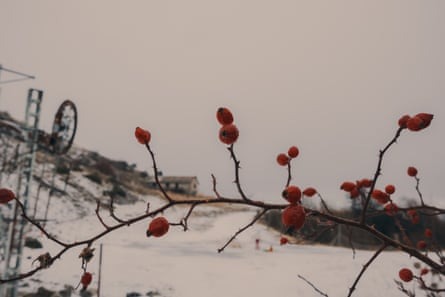 Berries can be see on dog rose shrubs which are starting to flourish now the piste is no longer cleared for skiers. Photograph: Thomas Valentin/The Guardian