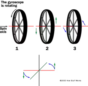 Figure 1: The gyroscope is spinning on its axis. Figure 2: A force is applied to try to rotate the spin axis. Figure 3: The gyroscope is reacting to the input force along an axis perpendicular to the input force.