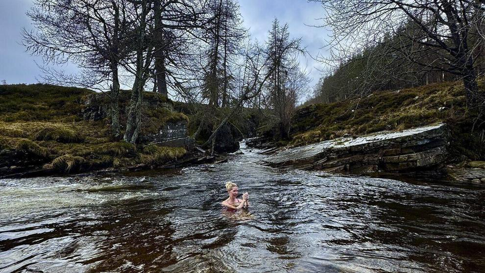 Tempting me at the water’s edge is a wood-burning sauna, converted from an old horse trailer, complete with a canvas warming tent and a wood-fired stove pitched beside it. Shivering from head to toe, I look over at my guide, Annie Armstrong, owner of the local tour company Wild Braemar, who is waist-deep like me but unflinching. As the river laps at her arms, she laughs through the cold.