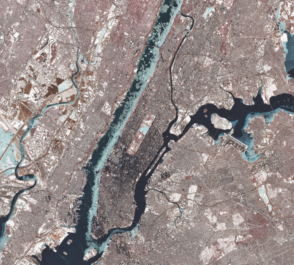 Feb. 8: The cold transformed the city’s geography. High-resolution satellite imagery revealed the Central Park reservoir and the Hudson River choked with ice.Satellite image by Copernicus. This image is a composite of infrared and visible-light data that highlights differences between ice (light blue) and open water, and snow and vegetation (red) from buildings and roads.