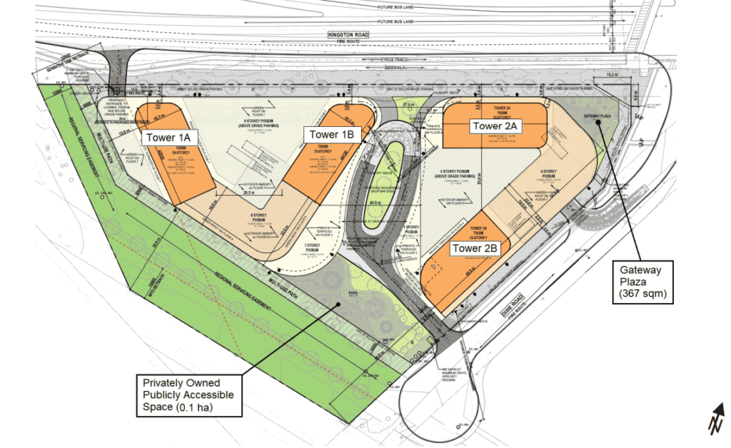 A gateway plaza of approximately 367 square metres is proposed at the northeast corner of the property, adjacent to the intersection of Kingston Road and Dixie Road. The applicant’s preliminary designs for the plaza include a public art feature, seating areas, and landscaping.