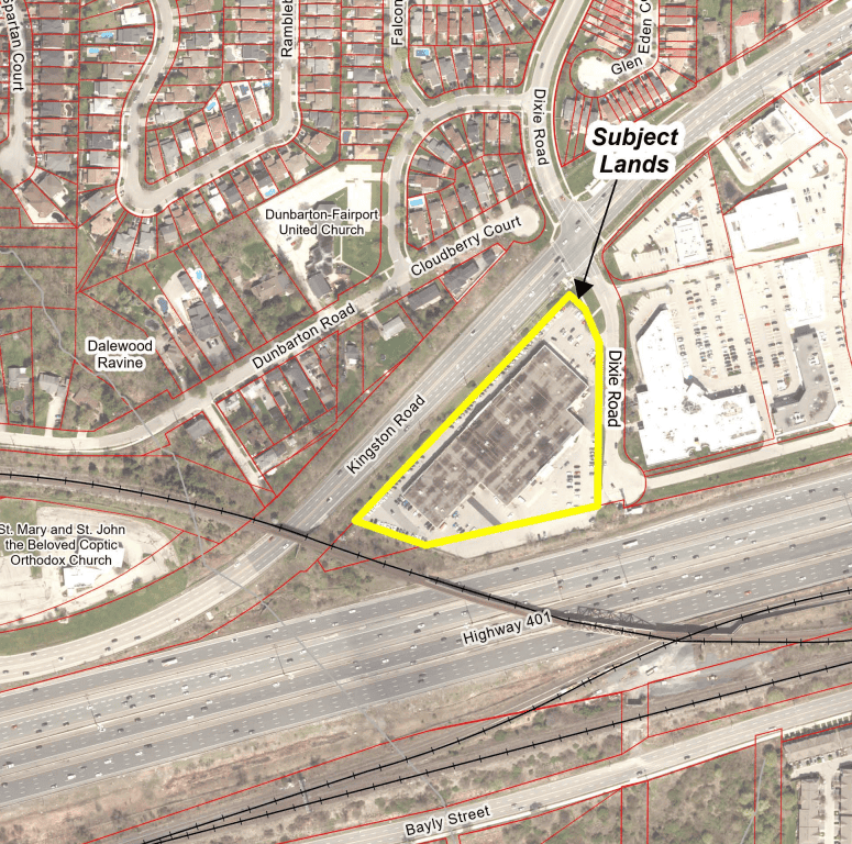 Access to the property is proposed from one driveway on Kingston Road, near the northwest corner, and two driveways on Dixie Road.