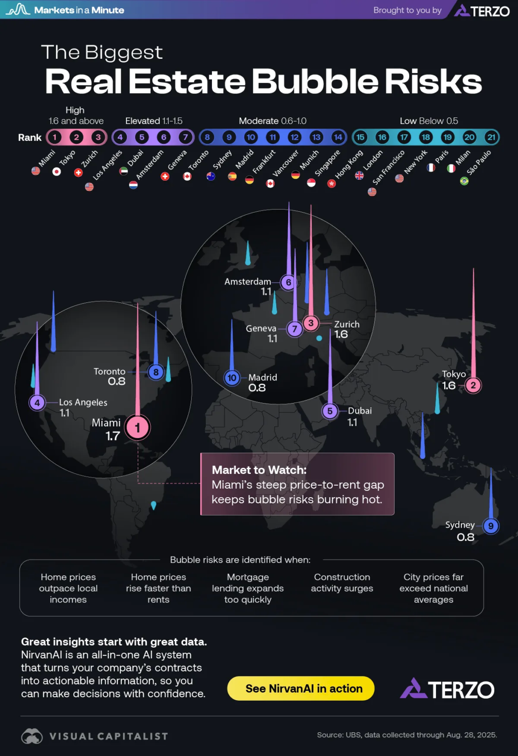Which housing markets could be headed for a correction? In cities like Miami, Zurich, and Tokyo, real estate prices are pushing past what local incomes and rents can justify. Amid these high prices, investors are watching closely for signs of instability.