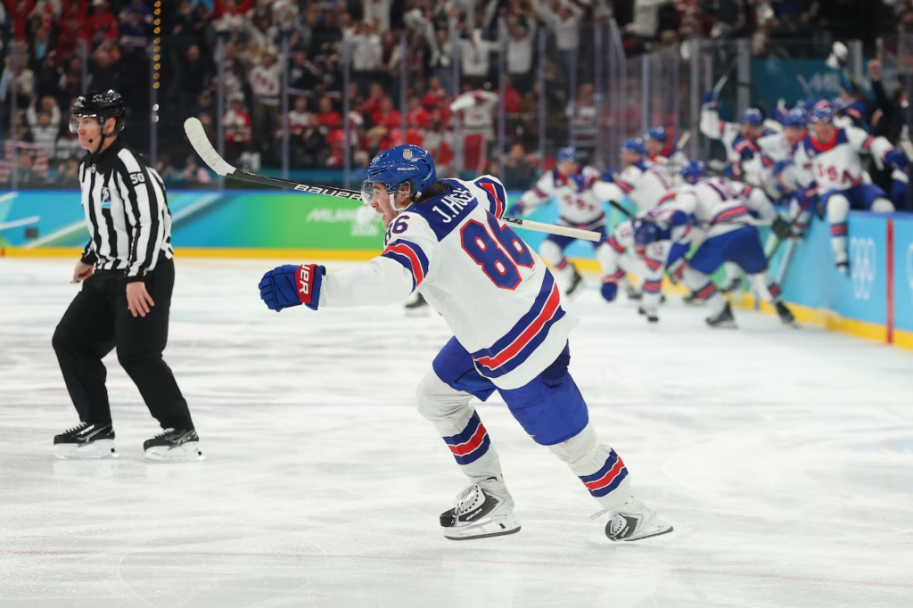 Jack Hughes #86 of Team United States celebrates after scoring the game winning goal to defeat Canada 2-1 during the Men’s Gold Medal match between Canada and the United States on day 16 of the Milano Cortina 2026 Winter Olympic games at Milano Santagiulia Ice Hockey Arena on February 22, 2026 in Milan, Italy. (Photo by Gregory Shamus/Getty Images)