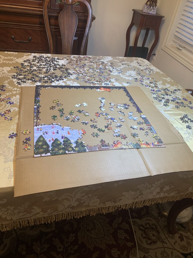 A day passed with little progress, and another day passed with still little progress. I asked her why, and she said it looked easy for others, but so difficult for her; it seemed puzzles weren’t her forte. A pile of pieces lay on the table, and over a week had passed, with only the bottom left corner pieced together—far from finished. It was supposed to be hung on the wall for Christmas, but Christmas was almost here, and it was still nowhere to be seen. That evening after dinner, I heard noises downstairs. It turned out reinforcements had arrived—my son was helping with the puzzle. He must have felt sorry for his mother and was giving her a hand. About three hours later, downstairs was quiet again. When I went downstairs before going to bed, I found a complete Christmas Eve picture lying there quietly.