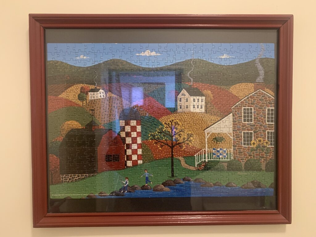 Speaking of my son’s jigsaw puzzle history, it goes back more than ten years to when he was not yet two years old. At that time, his grandparents came to visit, and having nothing to do, they bought a 500-piece country jigsaw puzzle while shopping at Costco. After that, every time they did a puzzle, he would stand by the table, running around, helping to get this and that; he was the busiest person of all. They finished it in a few days, and then bought an old picture frame for a dollar at the yard sale. I painted it dark red, put the puzzle in it, and it still hangs on the wall of the downstairs bathroom. Later, when he grew up, he completed two more puzzles, which are now hanging in his room.