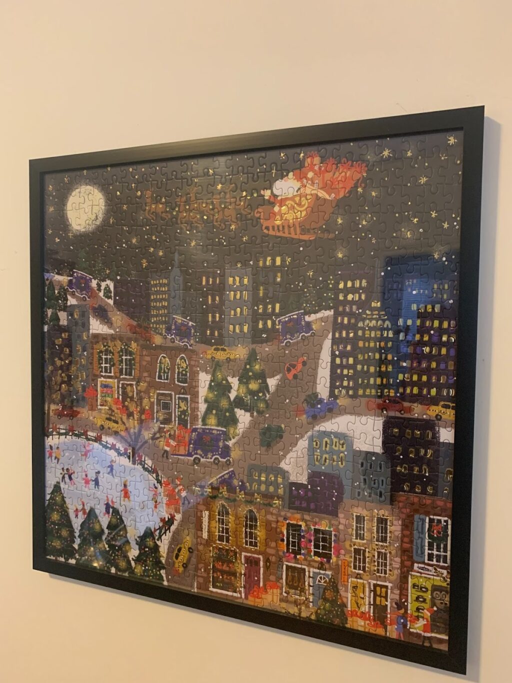 A while ago, my wife was preparing to take her three-week annual leave, which coincided with the Christmas holidays. Before that, she had been thinking about how to spend the holiday. Since she often browses “Little Red Book” (a Chinese social media platform), she saw some posts about jigsaw puzzles, which seemed like a good option. Although we had a few hanging on the wall at home, she had never done one, so she decided to give it a try. After much deliberation, she finally chose a Christmas jigsaw puzzle, decorated with lots of sequins, which she thought was very pretty. That day, we went to the INDIGO bookstore, but the one she liked was sold out, so she bought a similar one instead. You could tell she was quite excited.