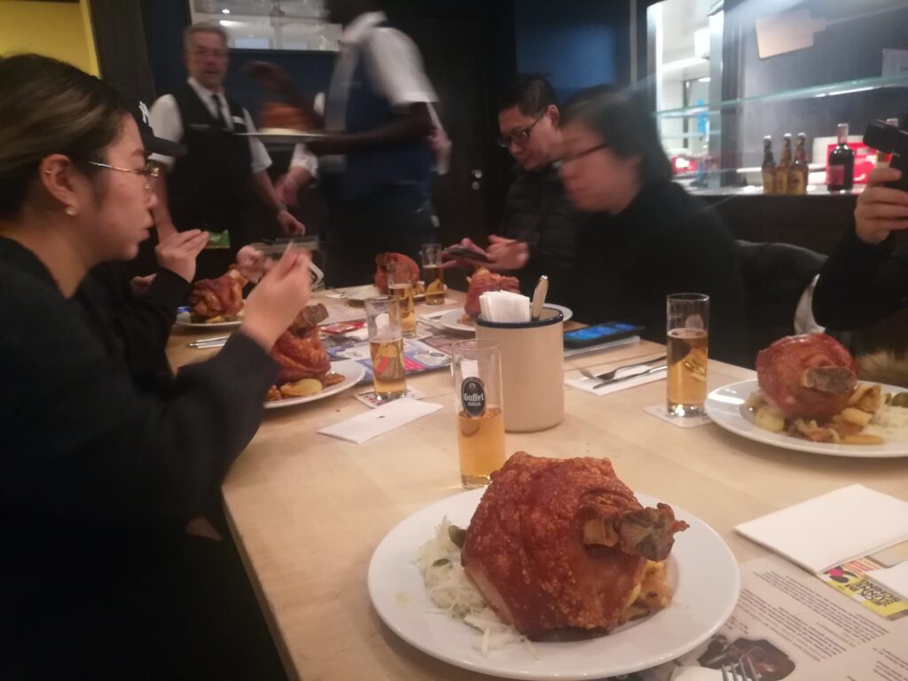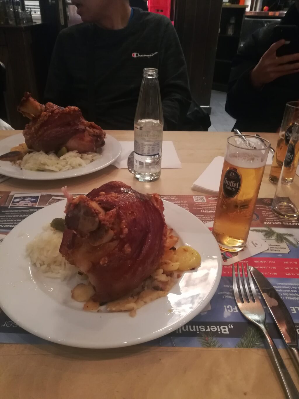 Upon entering the restaurant, we took our seats. The cups, plates, cutlery, and glasses were laid out, and each of us had a beer. When the waiter placed an enormous pork knuckle in front of each of us, the scene was quite comical; it seemed as if the table was completely covered in pork knuckle. Everyone was astonished, their eyes widening in surprise, as if they had never seen anything like it before.