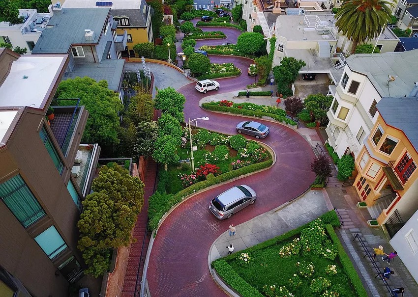 The section from Lombard Street to Leven Street is a steep downhill. In order to prevent traffic accidents, the municipal authorities deliberately built flower beds in 1923 and changed this section of road into a winding road. Cars driving here can only circle downhill, and the speed must not exceed 5 miles per hour. , this section of street is known as “the crookedest street in the world”. The design was first proposed by owner Carl Henry. Aiming to trade length for space to mitigate the size of the slope along the route (27%). The entire Jiuquhua Street is 600 feet (180 meters) long, and the straight section is 412.5 feet (125.7 meters) long, and is paved with bricks to increase friction.