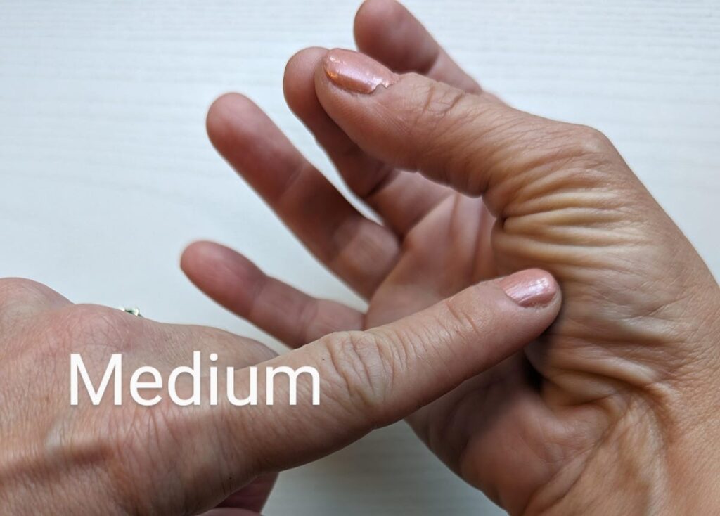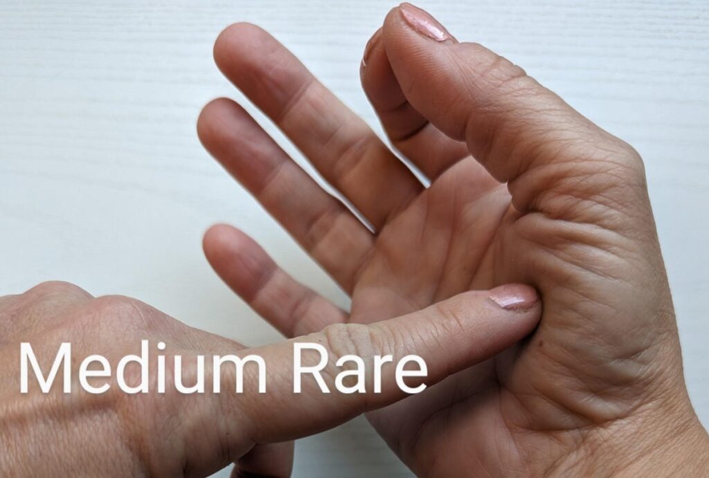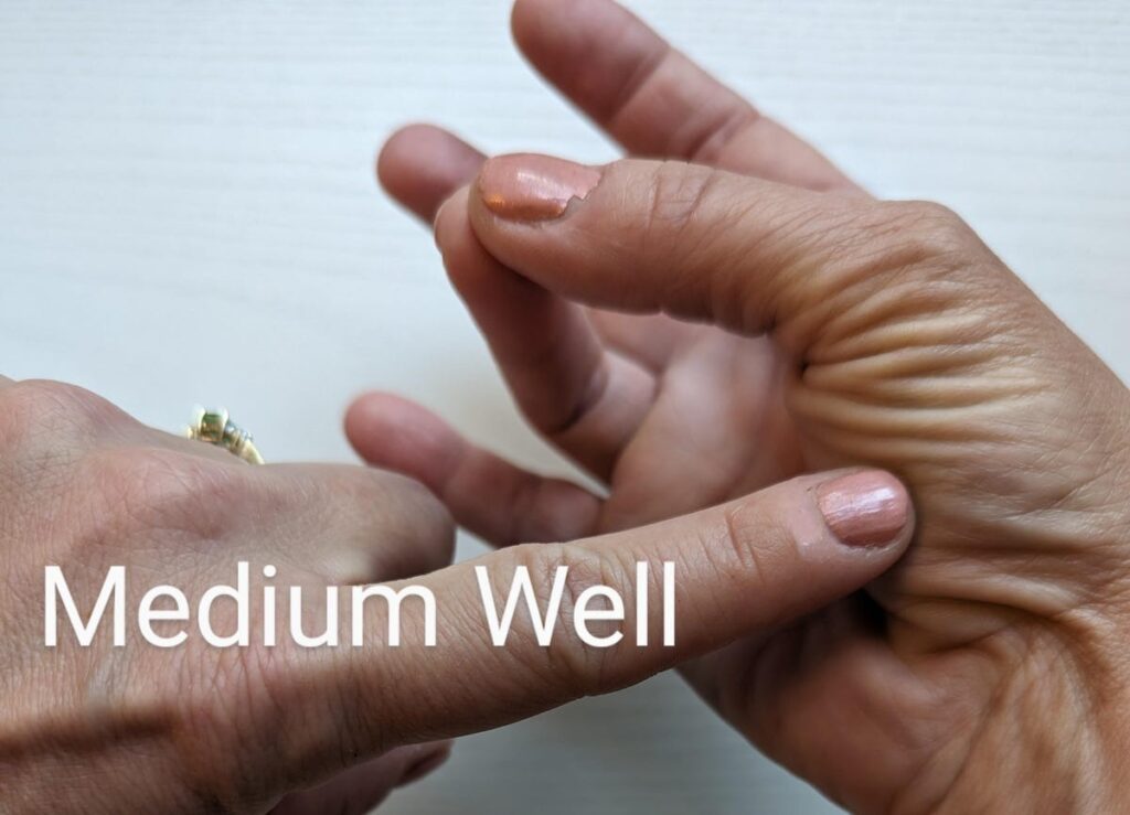 Subsequently, as you move your thumb to lightly touch your middle finger, the tension in the base of your thumb increases, and this represents how a medium-cooked steak should feel. As you stretch your thumb to reach the ring finger, now you’ve got medium well, and the tension in the thumb when touched with the pinkie finger reveals well done.