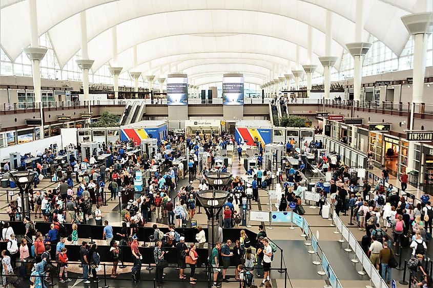 Travelers in long lines at Denver International Airport going through the Transportation Security Administrations. Editorial credit: Jim Lambert / Shutterstock.com