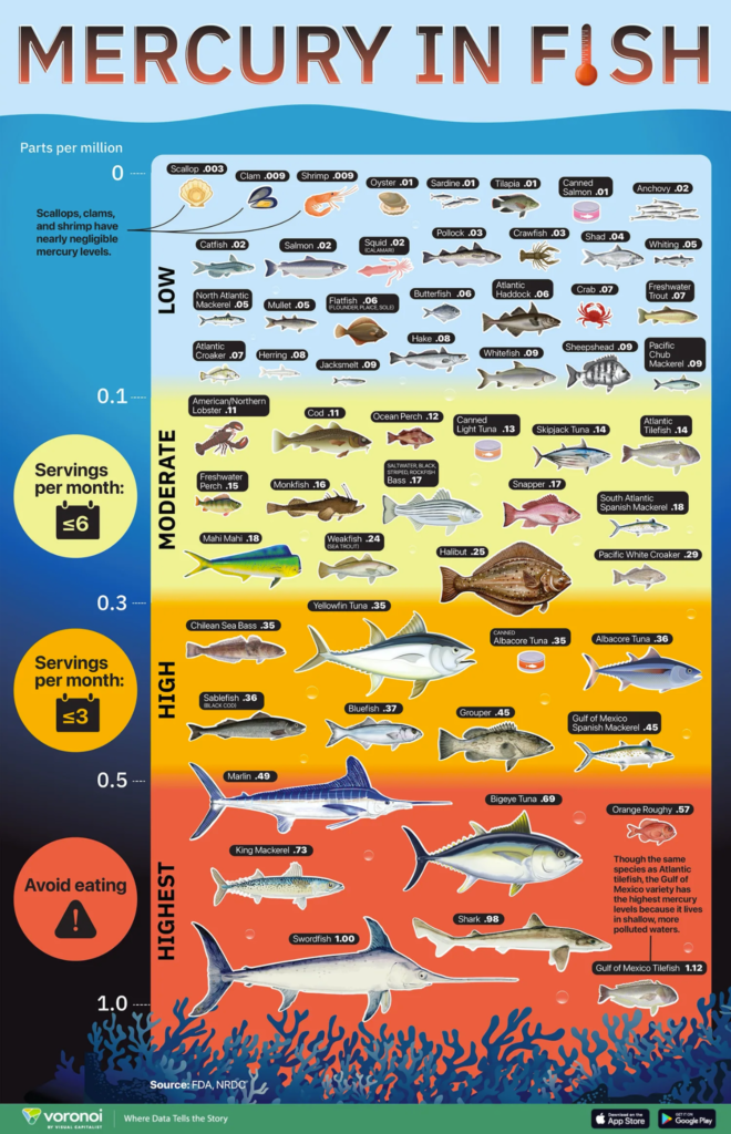 The FDA tracks mercury concentrations in commercial seafood, helping consumers make informed choices. The visualization by Julie Peasley summarizes these levels beautifully, grouping fish by mercury content and recommended servings per month.