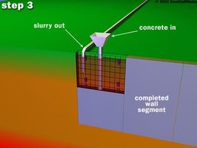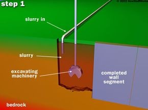 The process was pretty simple, at least conceptually. The crew used excavating machinery to dig 3-foot (1-meter) wide trenches down to bedrock level. As they dug, they piped in a slurry made of water and an expansive clay called bentonite. The bentonite slurry material would expand along the sides of the trench, blocking the groundwater.